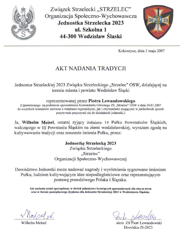 Nasze stowarzyszenie, które dziś występuje pod nazwą Jednostka Strzelecka 2023 im. 14 Pułku Powstańców Śląskich, zaczęło kształtować się w pierwszej połowie 2003 roku, kiedy to zebrała się w Wodzisławiu Śląskim grupa osób, których połączyły wspólne pasje i cele działania. W wyniku tych działań 20 czerwca 2003 roku powstał oddział terenowy ogólnopolskiej organizacji, którą jest Związek Strzelecki "Strzelec" Organizacja Społeczno-Wychowawcza. I taka też była początkowa forma naszej działalności, powołana do życia stosownym rozkazem organizacyjnym Komendanta Głównego ZS "Strzelec" OSW st. insp. ZS Jana Józefa KASPRZAKA.